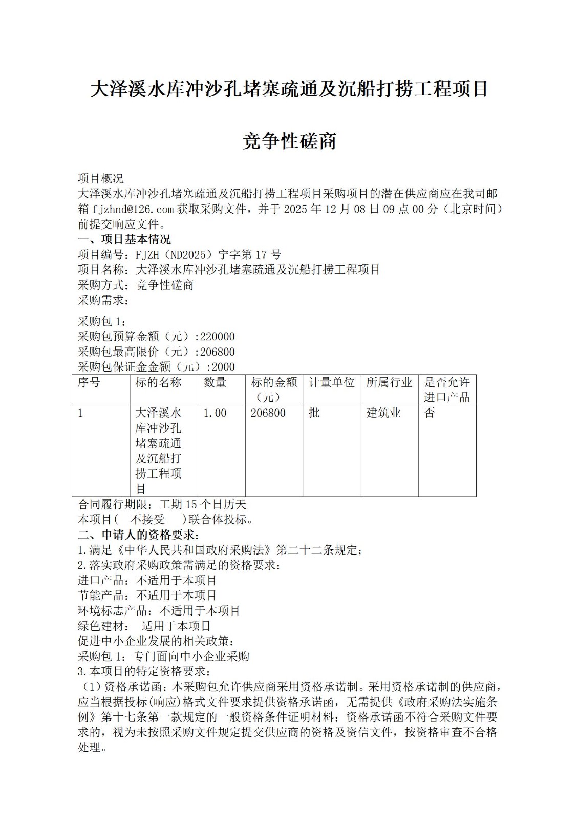 大澤溪水庫(kù)沖沙孔堵塞疏通及沉船打撈工程項(xiàng)目競(jìng)爭(zhēng)性磋商